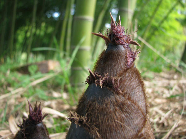 Generally warmer weather, growth rate increases to about 6 inches per day. Culm sheaths are peeling away near the base to reveal green canes. Young Moso canes are covered with a velvet-soft layer of microscopic hairs to protect itself from pests.