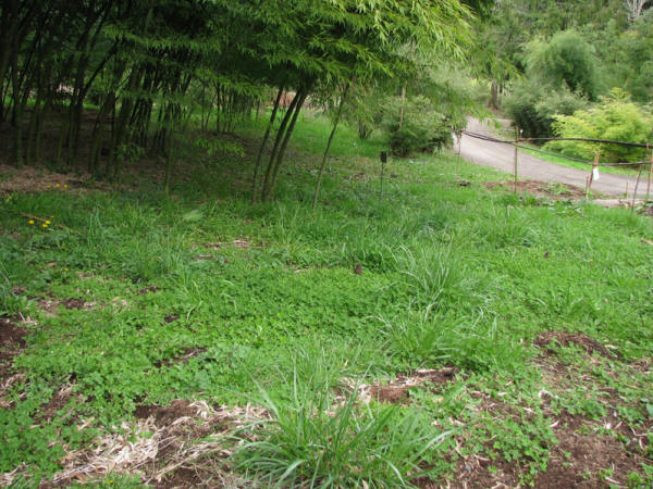 It is best not to rake or sweep up the bamboo leaves from under the plant, as they keep the soil soft and moist. Leaves also recycle silica and other natural chemicals necessary to the bamboo. Almost any organic material is a good mulch. A low-growing shade-tolerant groundcover plant that will allow the leaves to fall through to form a mulch without being visible will work if you find dry leaf mulch objectionable. Grass is one of the best organic mulch materials as it is high in nitrogen and silica. Homemade or commercial compost is also great. At our nursery we use a large amount of chipped trees from tree pruning services. This can harbor pathogens that may affect some trees or shrubs, but the bamboo loves it.