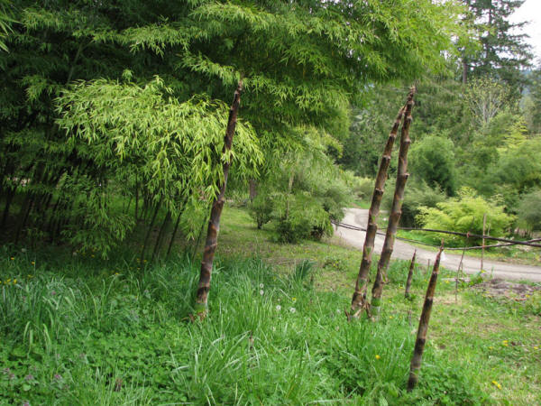 If supporting very large bamboo, metal stakes are recommended. A useful method for supporting long, tall screens is to put a sturdy post at each end of the screen and run a strong line between the two posts. Each bamboo can be loosely tied off the main line. A fence can serve the same purpose for bamboo about 15 feet tall.
